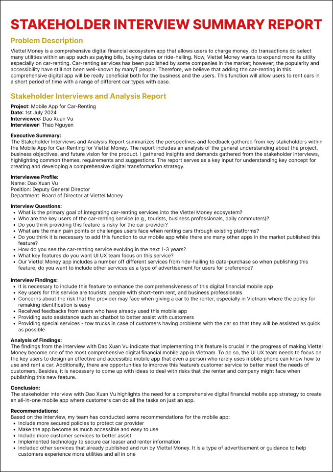 To better understand the specific needs and objectives behind integrating the new feature into the Viettel Money app, we conducted a stakeholder interview with Mr. Vu Dao, Deputy General Director of Viettel Digital. This conversation provided us with invaluable insights into the strategic vision for this feature, as well as the broader goals of Viettel’s digital financial ecosystem. By engaging directly with leadership, we were able to clarify the target audience, understand the operational challenges, and align our UX strategy with the company’s business goals.